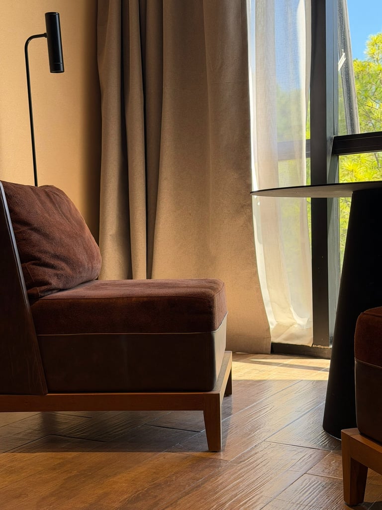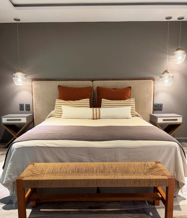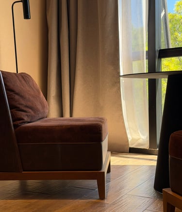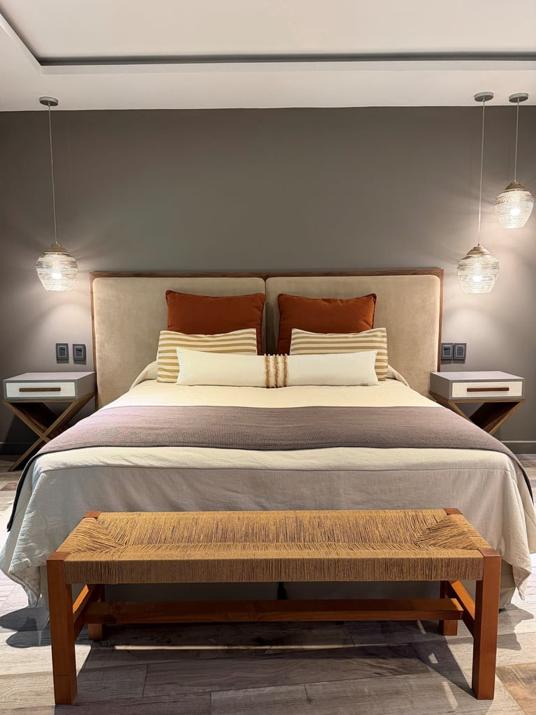 La intervención incluyó el equipamiento completo del lobby, el área de desayunador-restaurante y la sala de lectura. Además, fabricamos piezas a medida para 20 habitaciones premium, diseñando y produciendo respaldos de cama, espejos y bancos pie de cama.